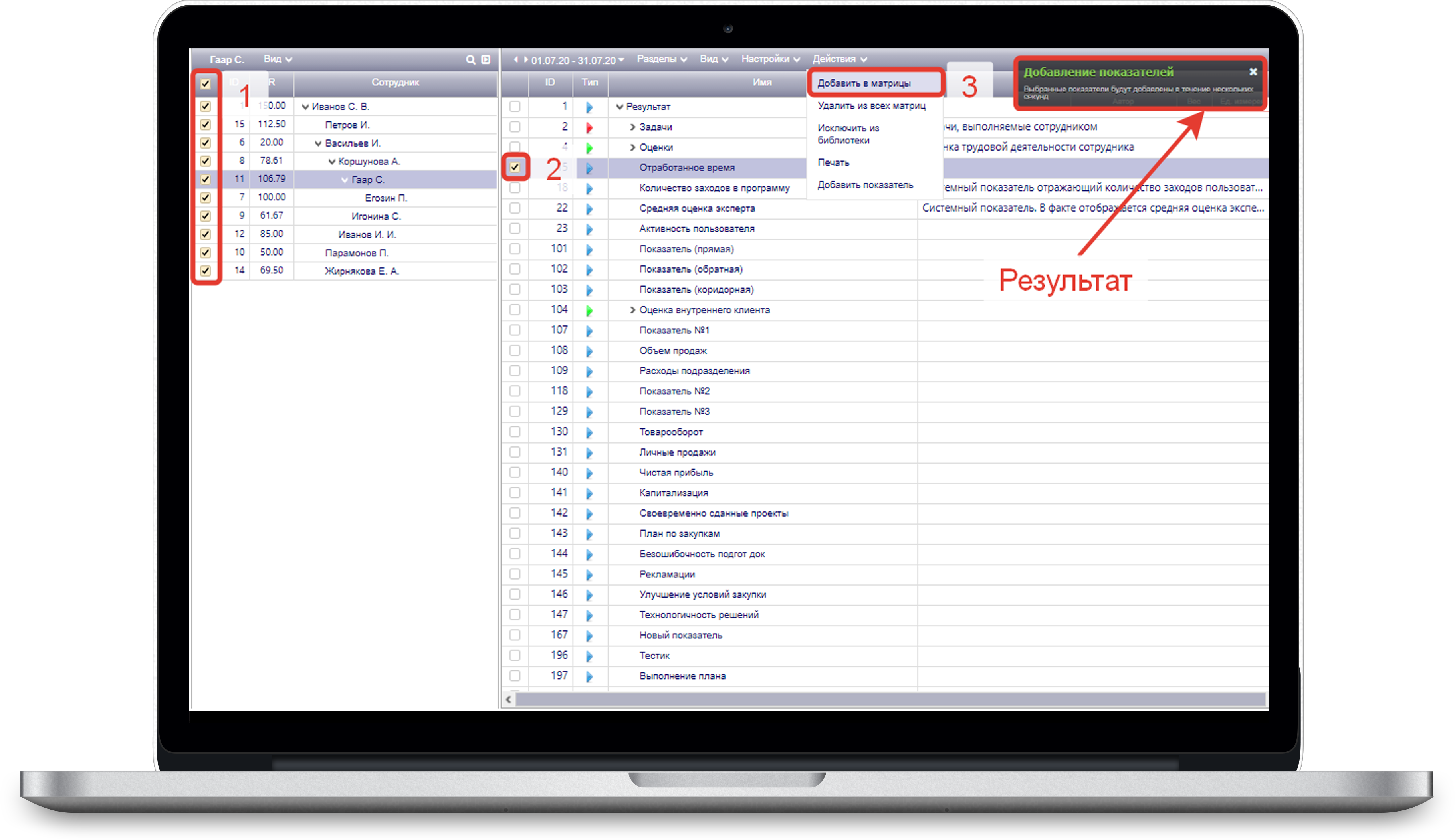 Теперь при настройке сотрудников выбрав показатель или сотрудника чек-боксом блокируется обновление выбранной матрицы или показателя (рис. 2).